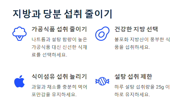 • 설탕 및 고탄수화물 식품 섭취 최소화